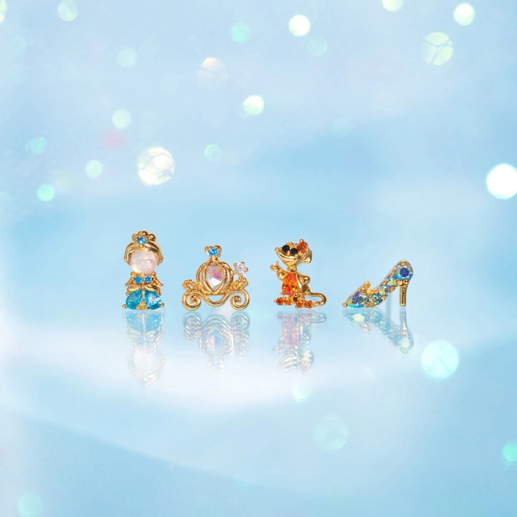 Adornado con hermosos y llamativos cristales; el juego de aretes de la Princesa Cenicienta de Disney es la pieza mágica que necesita tu guardarropa. Este juego de aretes le da vida al clásico cuento de hadas con Cenicienta, su zapato de cristal, el carruaje del hada madrina y Jaq. No tienes que preocuparte por lo que sucede cuando el reloj marca la medianoche, ya que este deslumbrante conjunto es perfecto para cualquier ocasión y agrega el toque perfecto de magia a cualquier atuendo.